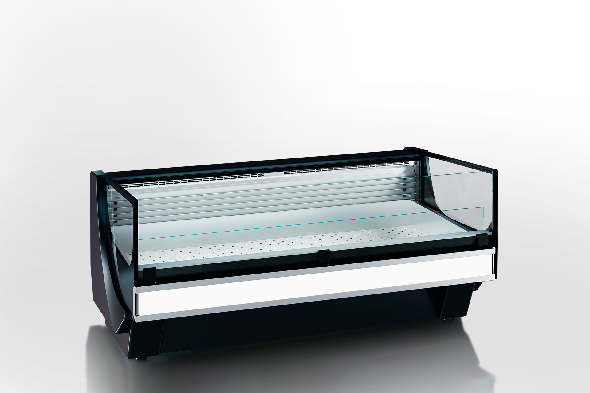 Specialized counter with additional refrigerated tray for fish-on-ice sales.