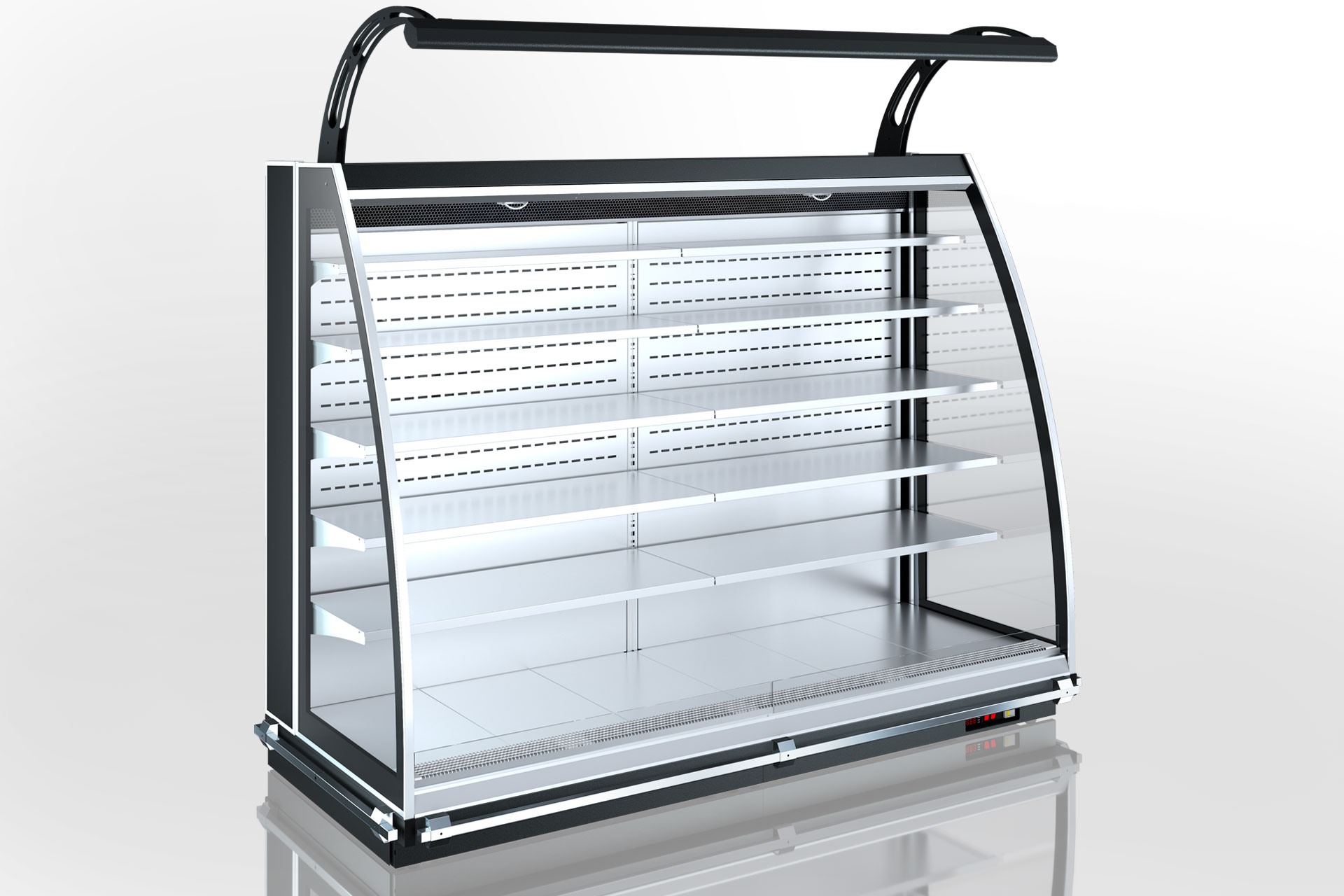 The supply group also included low-temperature display cases “Yukon cube MH 160 LT C M“, wall-mounted display cases “Indiana MV 080 MT O M“, semi-vertical display cases “Louisiana eco NB MSV 115 MT O M” and a specialized display case for the sale of fruits and vegetables “Indiana MV 080 FV O M“.