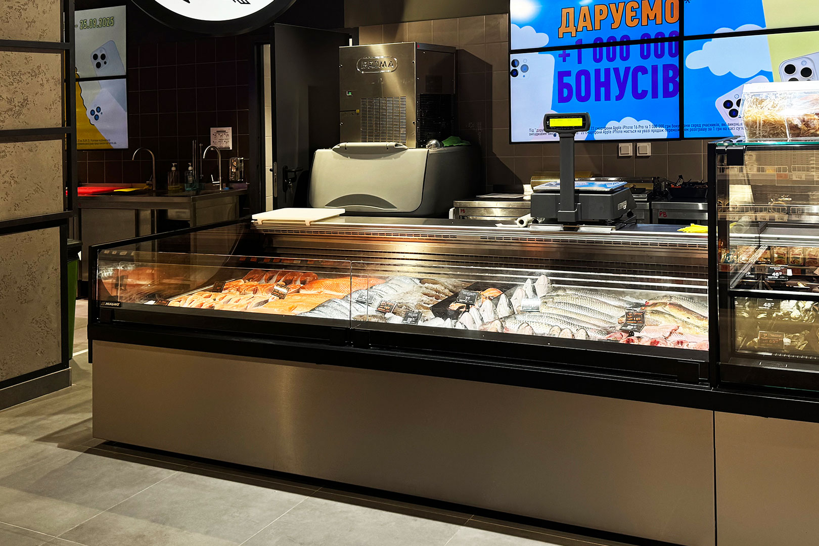 Спеціалізована вітрина з додатковим охолоджуючим піддоном для продажу свіжої риби на льоду. Для режиму самообслуговування доступна у виконанні self.