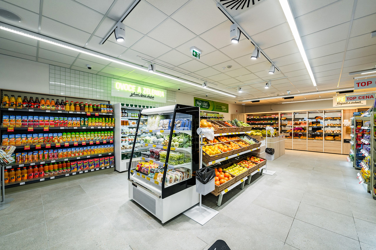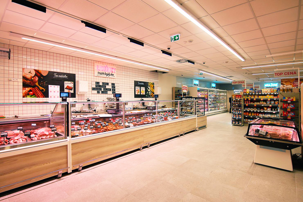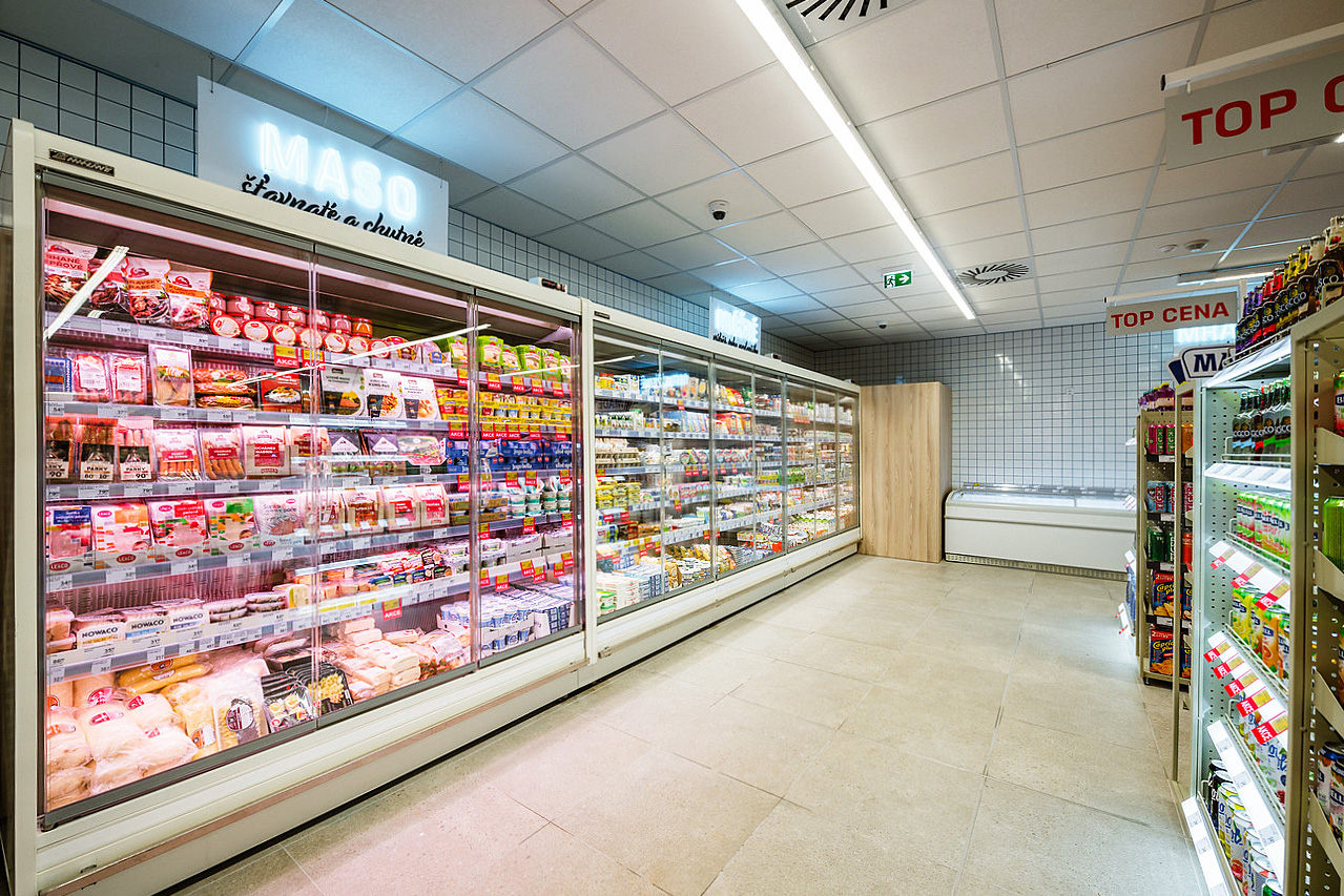 Холодильні вітрини Missouri MC 120 deli PS 130-DLM, промоціональна вітрина Virginia AI 114 deli self 134-DLA Virginia AK 100 deli self 083-DLA, пристінні вітрини Louisiana MV 095 MT D 210-DLM, маркет біля дому Flop, Чехія